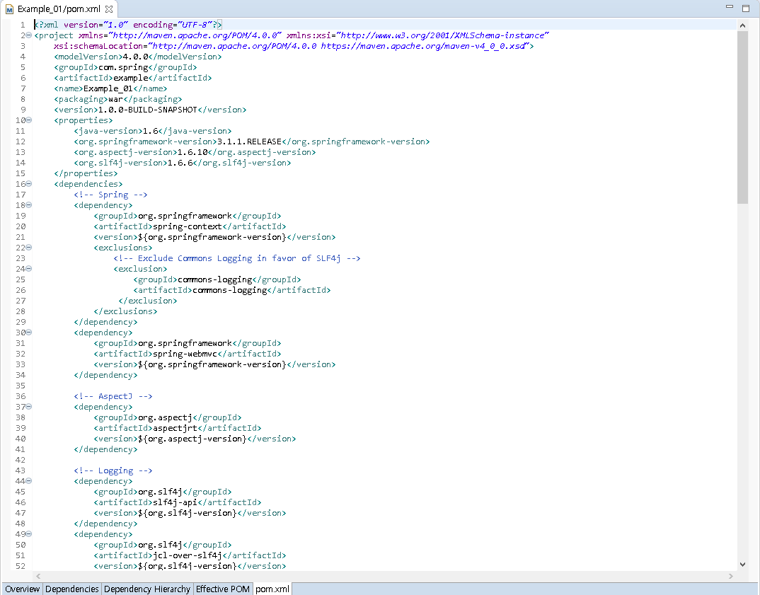 <properties></properties> 태그는 변수의 개념으로 많이 사용되는 변수를 선언해서 밑에서 편하게 쓰기 위해서이다. 많이 사용되는 값을 변수로 지정한다. 수정의 용이함이 있기에 일일이 찾아서 수정할 필요가 없다. <org.springframework-version>3.1.1.RELEASE</org.springframework-version> 처럼 변수 선언을 해 놓으면 밑에서 ${org.springframework-version}로 사용할 수 있다. 만약 버전이 바뀌면 선언한 곳의 버전만 수정해주면 된다.