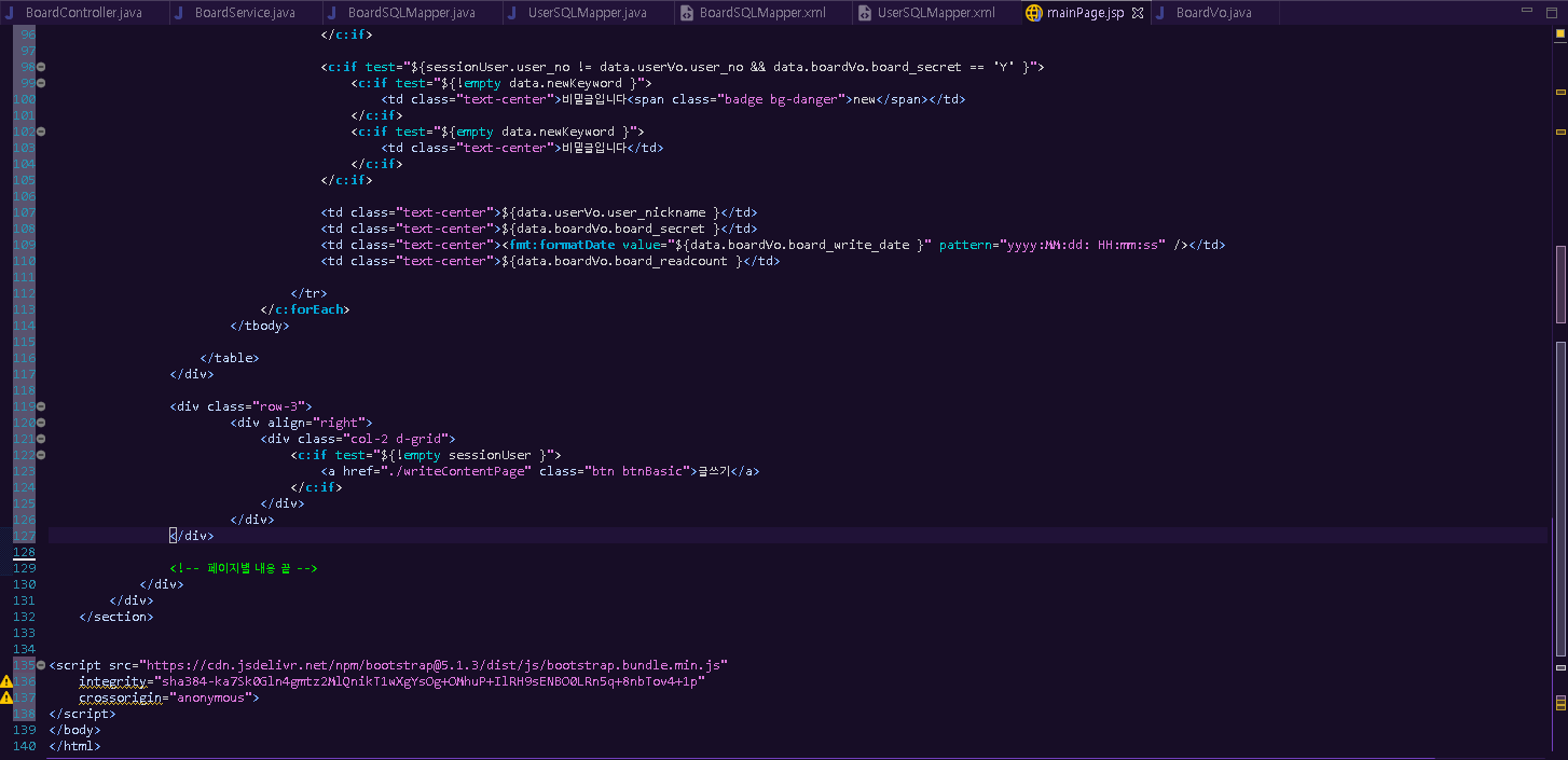 122행 : c:if item="${!empty sessionUser }"> : 로그인 여부를 체크한다. 로그인 햇다면 글쓰기 버튼을 노출 시키고 아니라면 노출시키지 않는다.