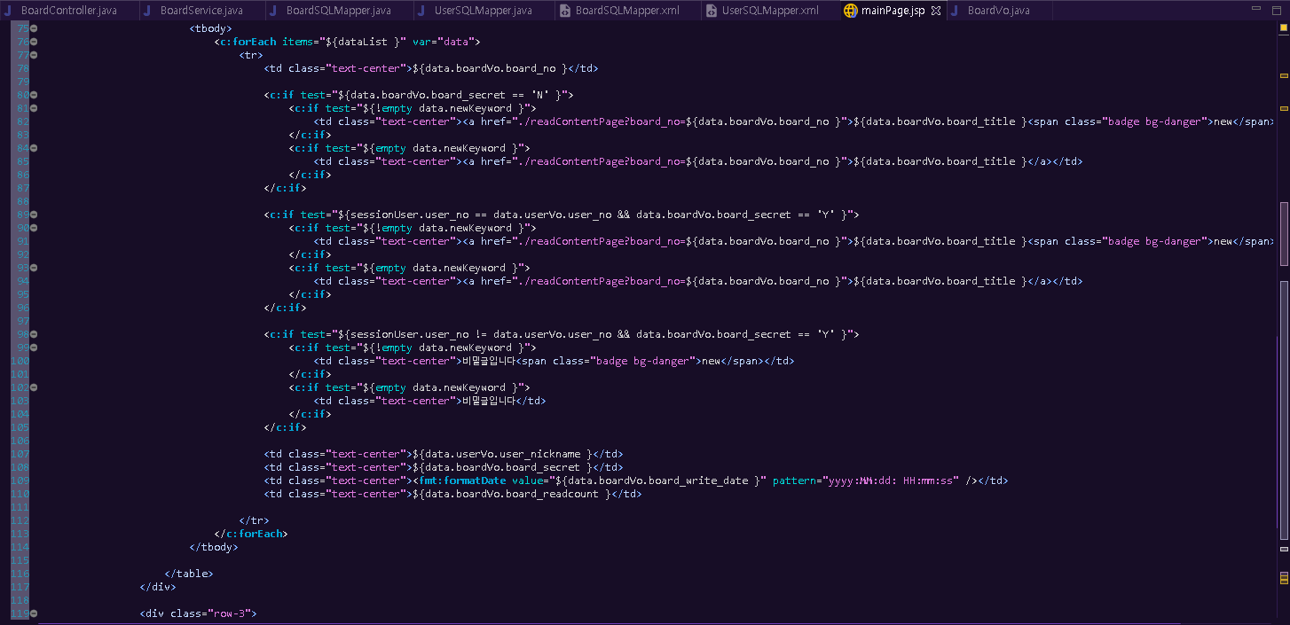 80~104행 : 비밀글 노출 여부에 관한 부분이다 로그인을 했는지 안했는지 로그인을 했다면 본인인지 아닌지 구분하기 위한 구문이다.