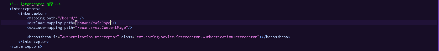 <exclue-mapping path="/board/mainPage"/> : 제외하고 인터셉터 처리한다.