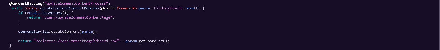 @RequestMapping("updateCommentContentProcess") : 요청 url 주소를 updateCommentContentProcess로 한다.